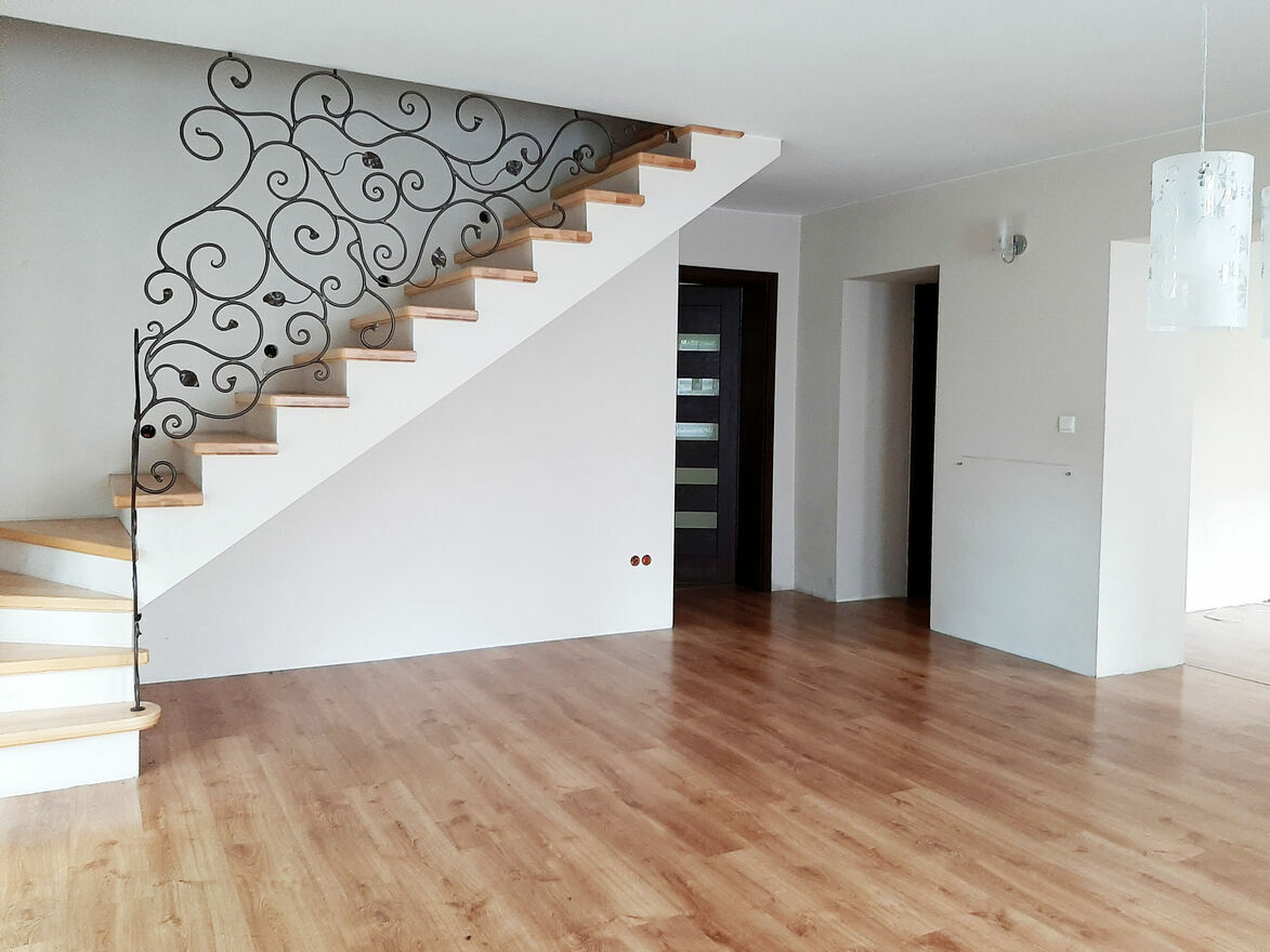 Na parterze znajduje się mieszkanie 5 pokojowe ( ok. 100 m2) , składające się z dużej kuchni, łazienki , spiżarki, dwóch sypialni, obszernego pokoju dziennego z wejściem schodami na poddasze , gdzie mamy dużą sypialnię i garderobę.